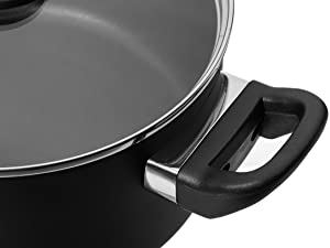 Comfortable, stay cool soft-touch handles, glass lid with steam vent.
