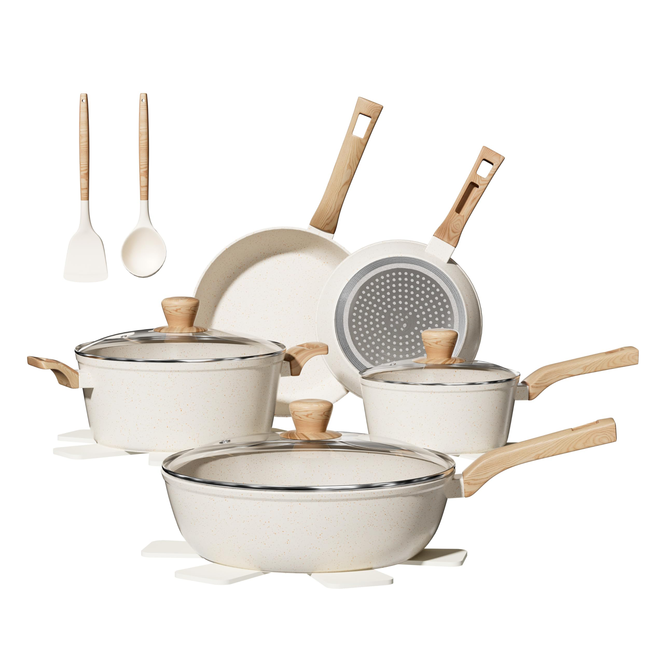 - WHITE GRANITE NONSTICK FOR EFFORTLESS COOKING Featuring a state-of-the-art white granite nonstick coating, this cookware set offers superior nonstick performance. PFOS/PFOA free, this coating provides a healthier, safer cooking experience and ensures food slides off easily without the need for excessive oils or fats. The heat resistant surface holds and is therefore perfect for everyday cooking.