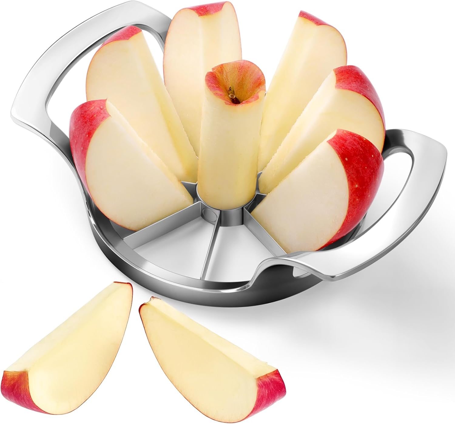 EASY TO USE: Choose fruits less than or equal to 4.2 inches. Aim at the core, easily push down the slicer to core through it, slightly twist, and get rid of the core. Then you get 12 perfect apple slices right away! The ergonomic & smooth zinc-alloy grip will help you cut with ease. The ultra-sharp blade will bring you a great fruit cutting experience.