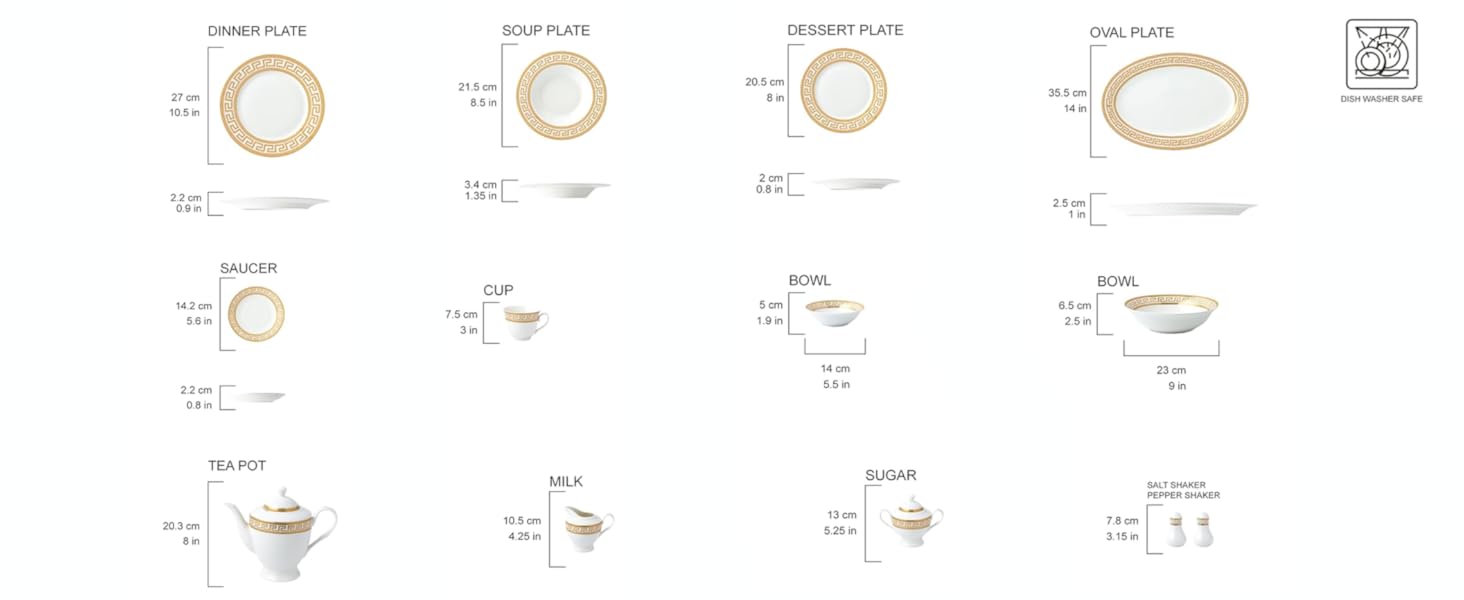 10.5" Dinner Plates, Eight 8" Salad Plates, Eight 8.5" Soup Plates, Eight Tea Cups, Eight Saucers, Eight 5.5” bowls, One 9” Salad Bowl, One 14” Oval Serving Platter, One Teapot (with Lid), One Creamer, One Sugar Pot (with Lid), 1 Salt Dispenser, 1 Pepper Dispenser